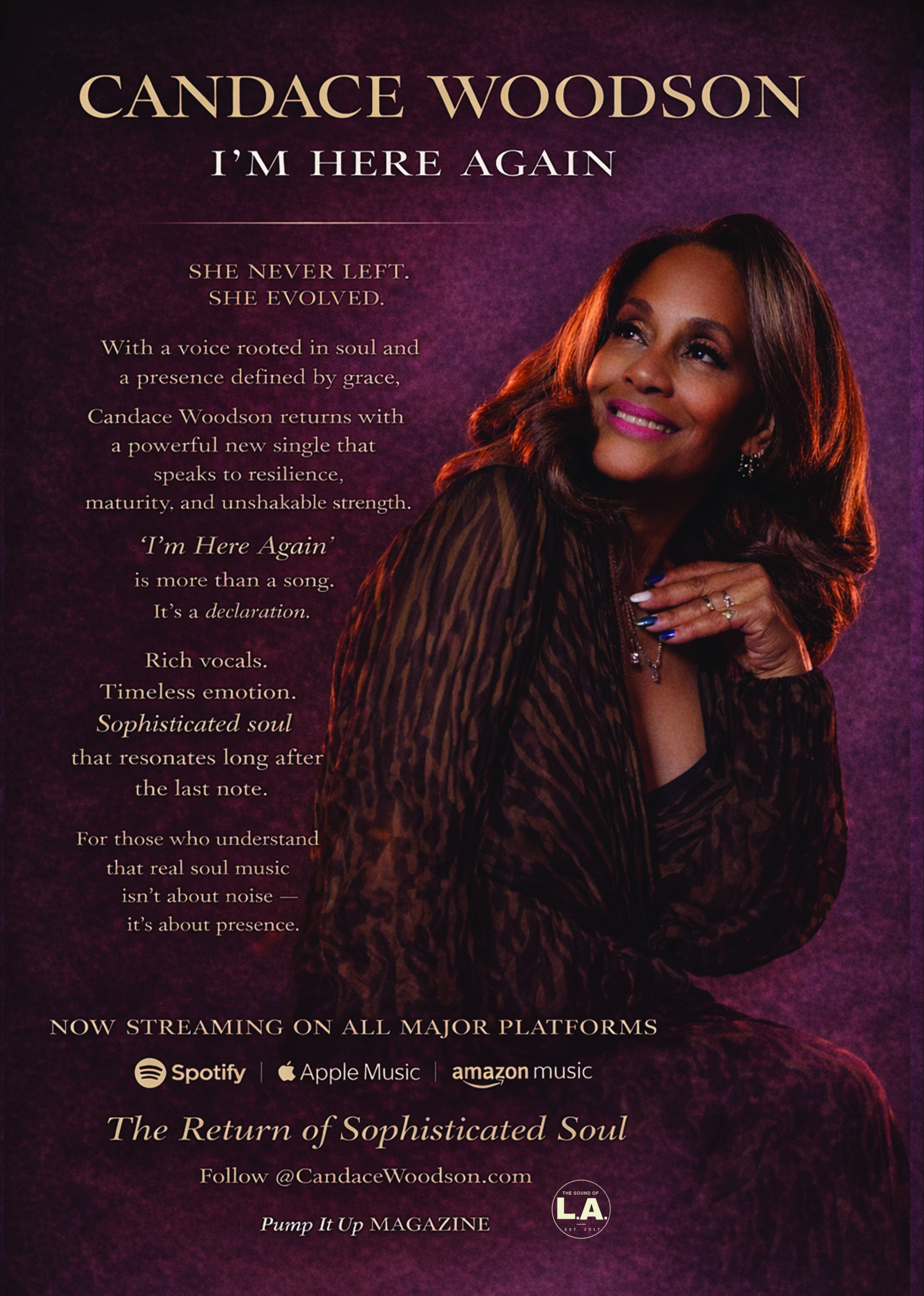 Candace Woodson graces our cover in a moment that feels both timeless and powerful. With her new single, “I’m Here Again,” she reminds us that true artistry doesn’t fade — it evolves.