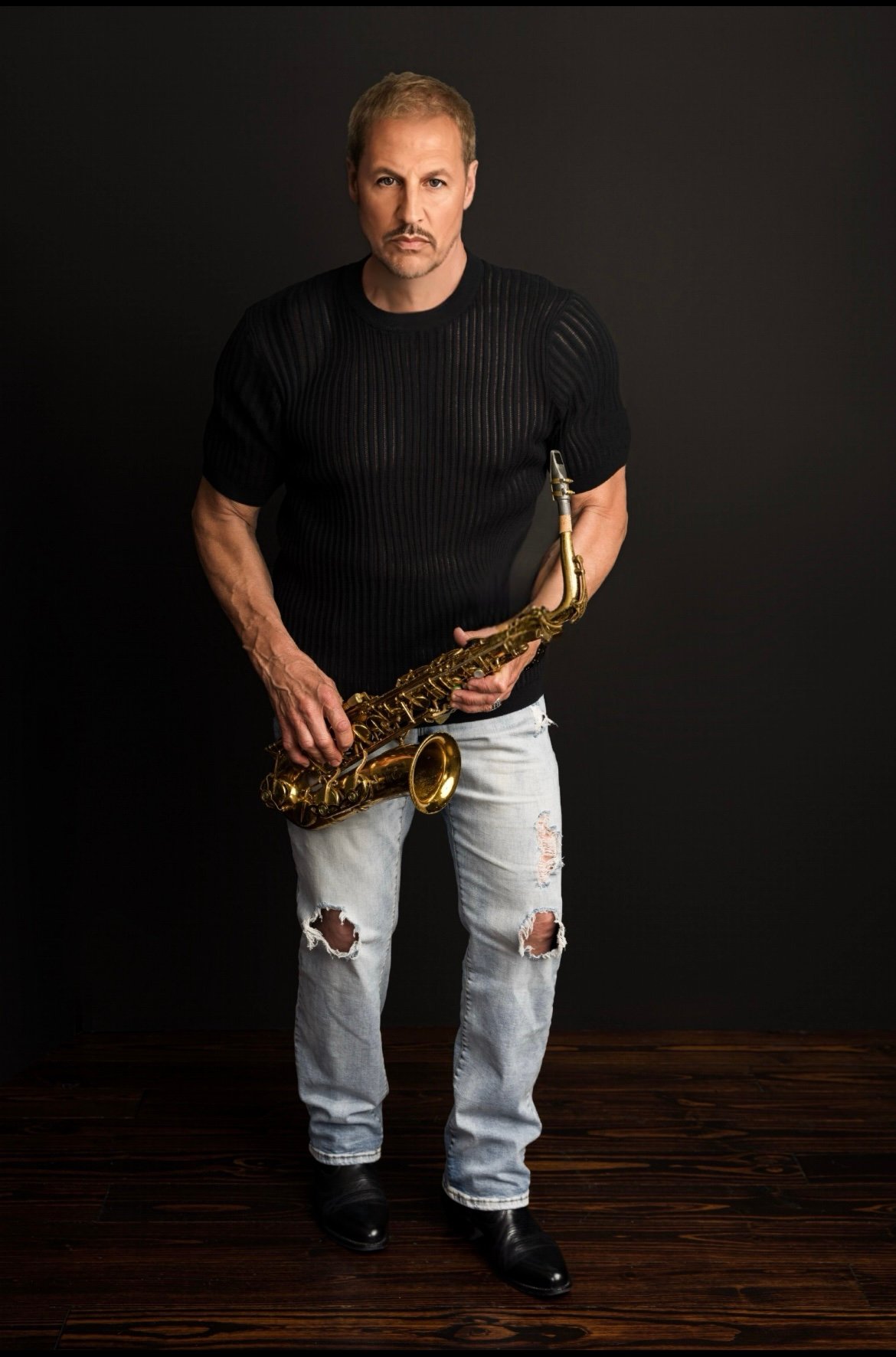 Michael Cates brings strength, soul, and style to every performance — captured here in a powerful studio portrait with his saxophone.
