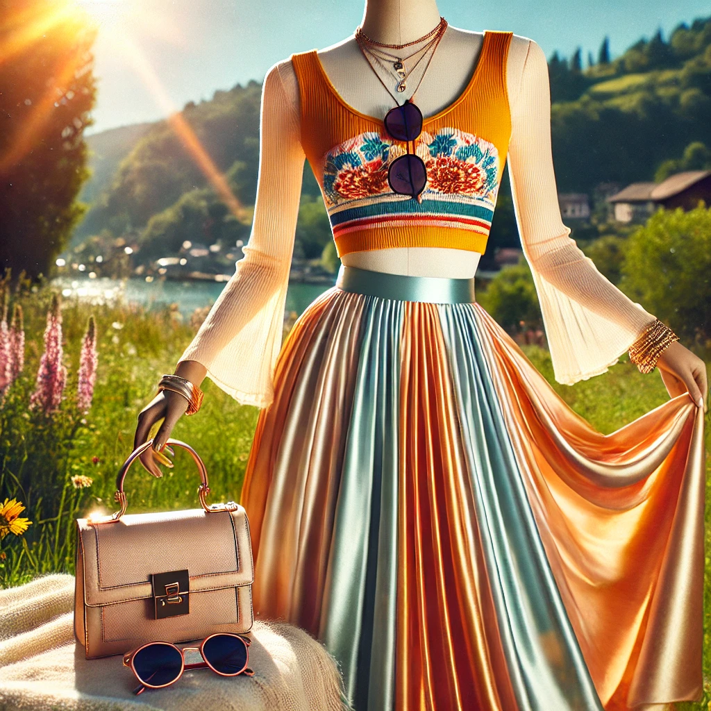 A vibrant summer outfit display featuring a stylish crop top paired with a flowing silk maxi skirt. The crop top is bright and trendy