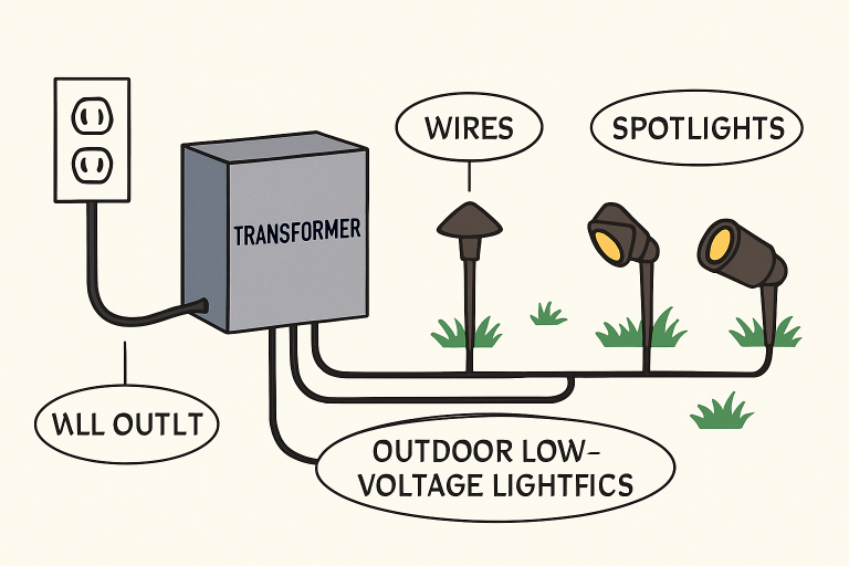 - Systems include a transformer, fixtures, and low-voltage wiring.